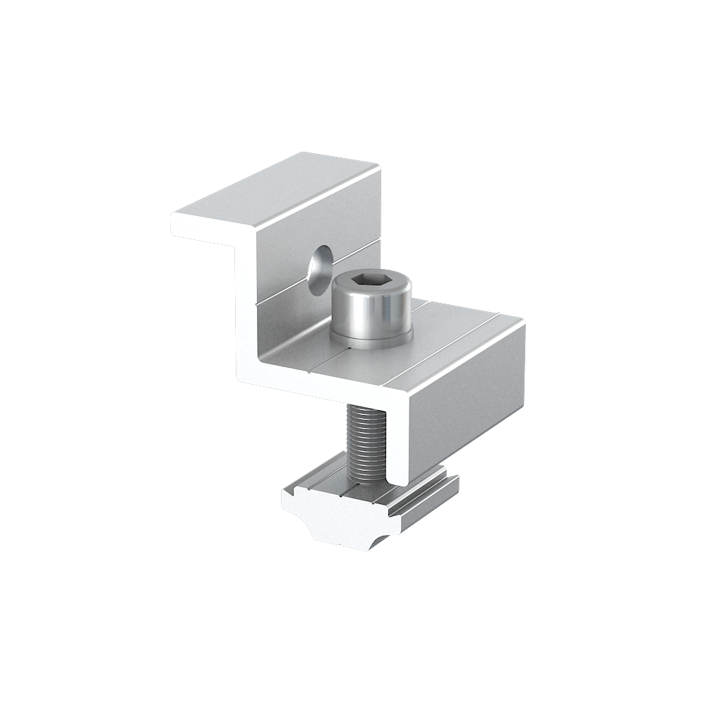 The end-clamp is mounted on the panels situated to the edge of the PV array. The purpose is to ensure the modules are secured properly to the main roof anchor